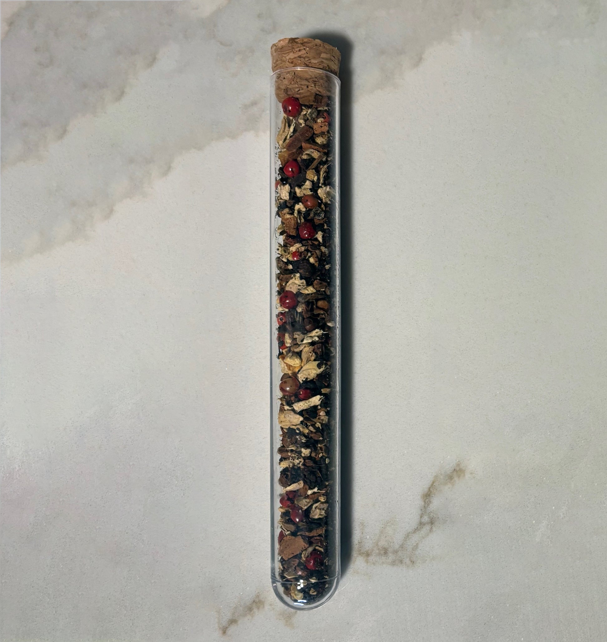 A test tube of small-batch, handcrafted tea. Each unique blend is inspired by the season, and prepared with care.
