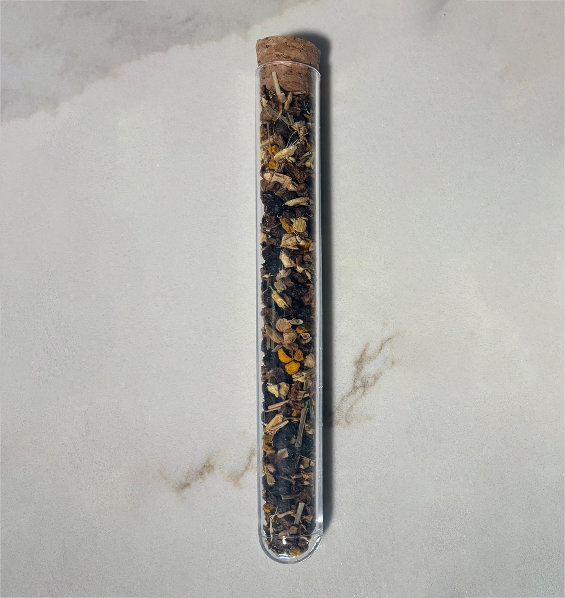 A test tube of small-batch, handcrafted tea. Each unique blend is inspired by the season, and prepared with care.